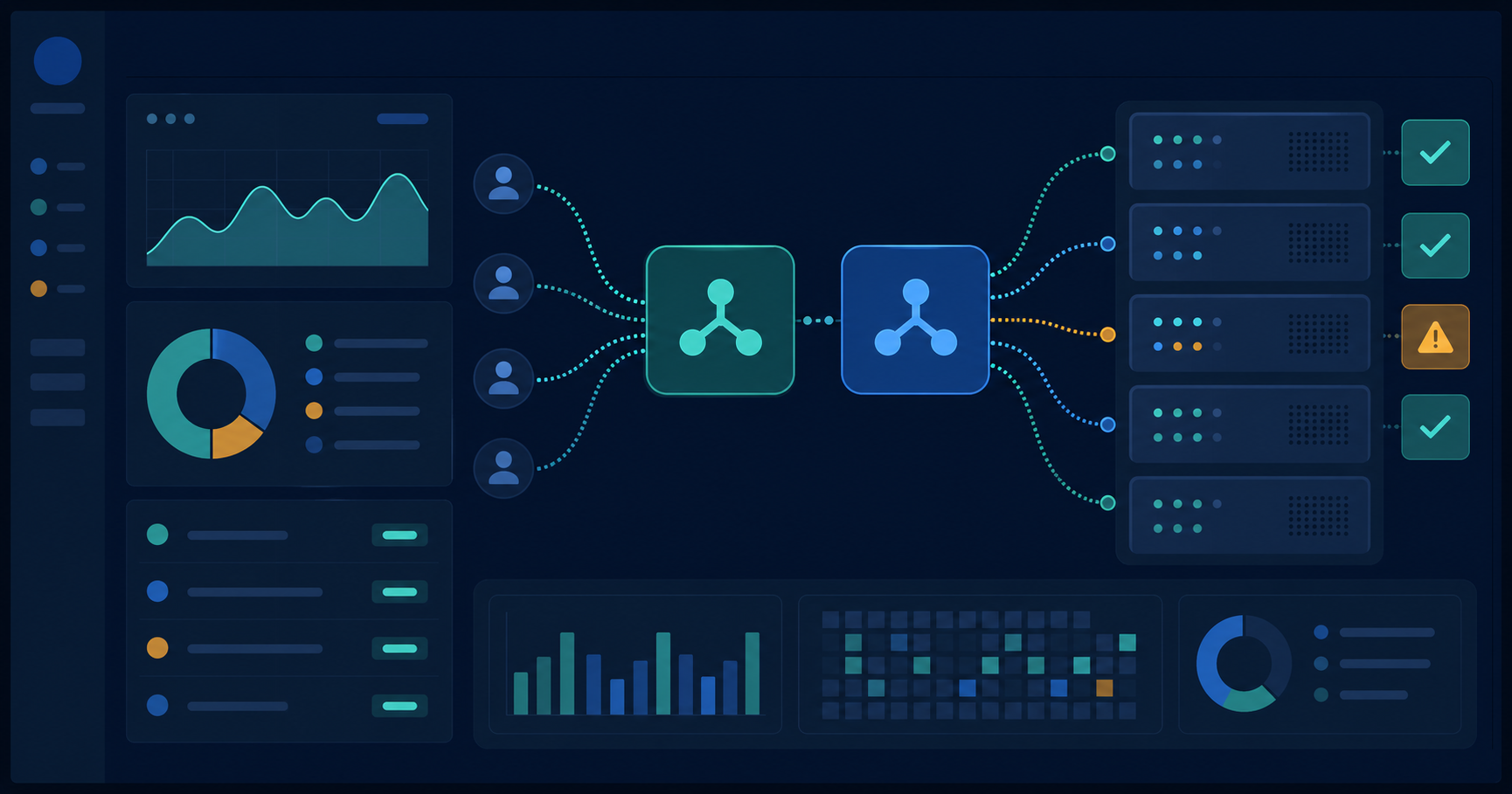 Nginx의 stub_status 모듈은 간단한 내부 엔드포인트로 active connections, accepts, handled, requests, reading, writing, waiting 지표를 노출합니다. waiting이 비정상적으로 높다면 keepalive 큐가 쌓이는 것이고, reading이 높다면 클라이언트 요청 수신이 느린 것입니다. HAProxy는 /haproxy-status 페이지를 통해 각 서버의 세션 수, 상태, 헬스체크 히스토리를 HTML 테이블로 보여줍니다.